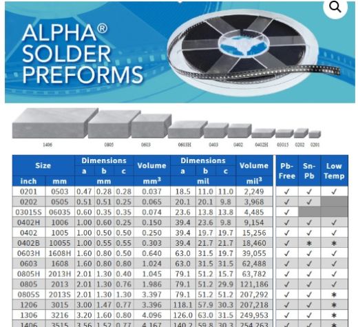 L'étendue cette gamme de produits comprend des rectangles fluxés et non fluxés, des rondelles, des manchons et des formes personnalisées pour des applications spécifiques. Profitez d'un portefeuille d'alliages complet comprenant des alliages d'assemblage standard, des alliages haute fiabilité et des alliages à faible point de fusion. L'utilisation d'un emballage en bande et bobine offre une facilité de mise en œuvre dans les lignes de fabrication SMT standard.